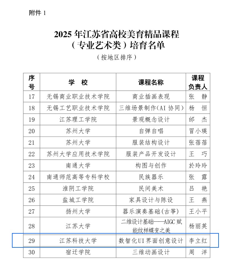 近日,江苏省教育厅公布了2025年江苏省高等学校精品美育课程名单,江苏科技大学机械工程学院工业设计专业申报的《数字化UI界面创意设计》课程从全省众多参评课程中脱颖而出,取得了巨大成功。